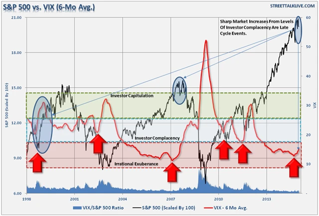 6měsíční průměr indexu volatility je dobrým indikátorem toho, kdy se na trhu začne dít něco většího než jen korekce využitelná k nákupům. Když se 6měsíční klouzavý průměr indexu změní, bývá to obvykle vhodná doba přehodnotit expozice v rizikových aktivech.