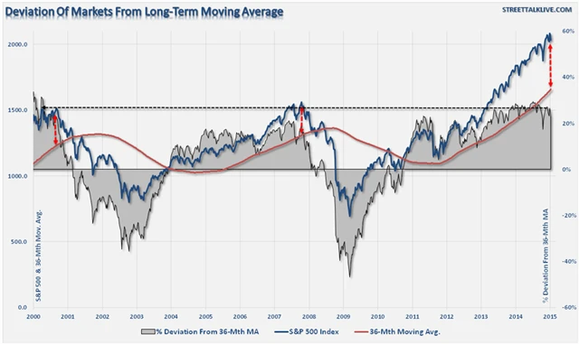 Trhy nejsou imunní vůči zákonům fyziky. Co jde nahoru, musí také někdy dolů. Lze to přirovnat ke gumovému náramku - ceny akcií jsou připoutány k dlouhodobému klouzavému průměru, který na ně působí jao magnet. Když se ceny aktiv příliš odchýlí od dlouhodobého průměru (například 36měsíčního), musí se zase nakonec nevyhnutelně vrátit do jeho blízkosti.