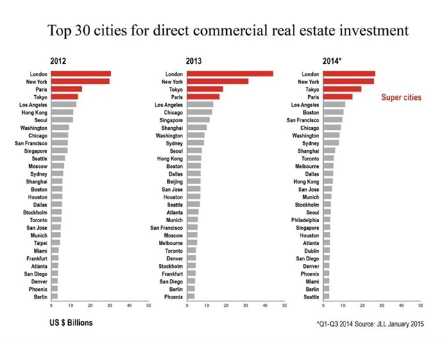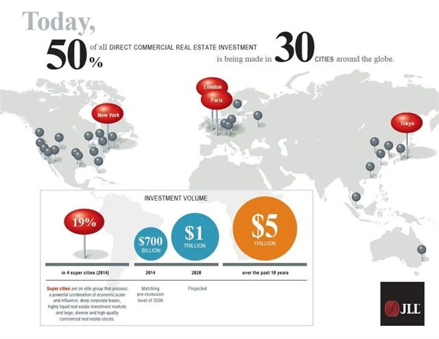 Analýza identifikuje 30 měst, kterým dohromady přitekla polovina z celkových 5 bilionů USD přímých investic do komerčních nemovitostí za poslední dekádu.