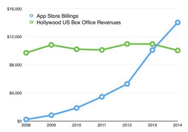 Roční tržby z mobilních aplikací nyní převýšily roční příjmy Hollywoodu.