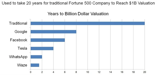 - Výrazně se zkrátila doba, za kterou vzroste hodnota firmy na 1 miliardu dolarů, a to z dřívějších 20 let na 2 roky.