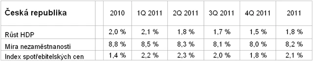 Přestože není výhled na rok 2011 pro Českou republiku nijak oslnivý, stav ekonomiky se zlepšuje, a to by se mělo odrazit i v lepší situaci na trhu práce. Míra nezaměstnanosti se v posledních dvou čtvrtletích roku 2010 tvrdošíjně držela nad 8,5 %, ale s tím, jak bude nabírat na obrátkách oživení, se bude podle našich očekávání zlepšovat i nálada podniků, které začnou nabírat nové pracovníky. Proto předpokládáme, že v průběhu roku 2011 bude míra nezaměstnanosti průběžně klesat. Růst komodit tlačí ceny nahoru