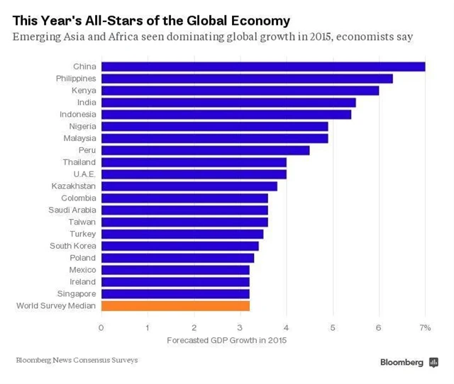 Jen pro srovnání, ekonomiky USA a Spojeného království, které k celosvětové hospodářské expanzi přispívají asi čtvrtinou, by letos měly vzrůst o 3,1 %, respektive 2,6 %. HDP eurozóny by se měl v roce 2015 zvýšit jen o 1,2 %, což by do značné míry mělo být zapříčiněno přetrvávající nejistotou ohledně budoucnosti měnové unie přiživovanou překotně se vyvíjející řeckou dluhovou krizí.