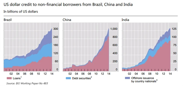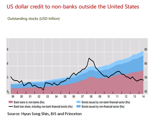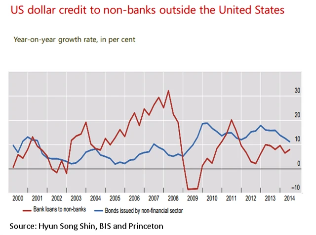 Na rozdíl od období před rokem 2010 došlo k růstu úvěrů na dluhopisovém trhu, ne v bankovním sektoru. To je jasný důkaz toho, že je trh poháněn kvantitativním uvolňováním Fedu způsobujícím snižování rizikové prémie k výnosům vládních dluhopisů. Na světových úvěrových trzích vypukla honba za výnosy a vznikl pohotovostní zdroj pro financování firemních dluhů na rozvíjejících se trzích. Celkový "úvěr" v dolarech poskytnutý nefinančnímu sektoru na mladých trzích vzrostl v posledních pěti letech z 6 na 9 bilionů USD.