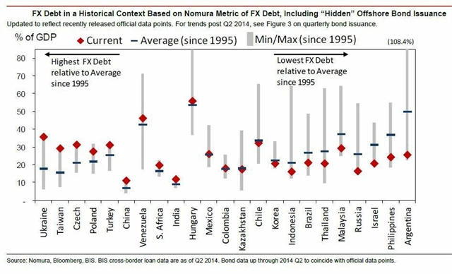 Tým Jense Nordviga z Nomury se u každé země zaměřil na "stínové dluhy" (domácí i zahraniční). S celkově nízkými úrovněmi zadlužení není hlavním problémem úvěrová kredibilita hlavních rozvíjejících se trhů, ale může být velmi obtížné najít politicky akceptovatelné způsoby přelévání oficiálních rezerv směrem k problémovým dlužníkům mezi firmami. Vlády budou jednat příliš pomalu, nebo se raději obrátí s žádostí o odpisy špatných úvěrů na zahraniční věřitele, než aby čerpaly úzkostlivě chráněné státní rezervy.