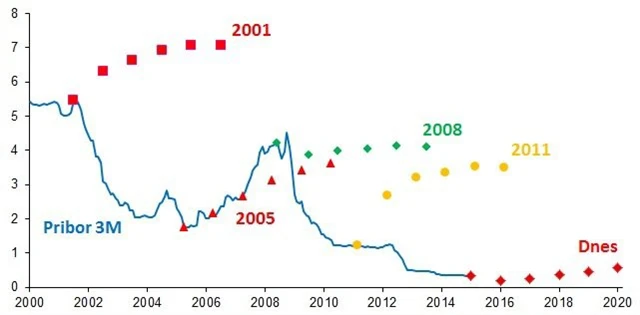 - Tržní dolarové sazby dosáhly maxima v půlce roku 2007 a začaly padat. Eurové a korunové sazby rostly do léta 2008. Fed po třech letech otočil úrokový cyklus a začal sazby snižovat. ČNB a ECB pokračovaly ve zvyšování sazeb, ECB dokonce ještě v červenci 2008.