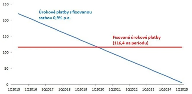 Pro ukázku porovnejme úrokové náklady na zajištění desetiletého úvěru na 3M Pribor v objemu 100 milionů Kč se čtvrtletním lineárním splácením do nuly. Sazba IRS vychází na 0,9 % p.a., lineární úrokový náklad asi 116 400 Kč na periodu.