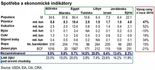 Demonstrující chtějí ekonomickou, a s ní i politickou změnu. Řada vládnoucích stálic v čele s egyptským prezidentem Husním Mubarakem se třese o svou budoucnost. Situaci v Alžírsku, Maroku, Egyptě, Tunisku, Libyi, Izraeli, Jordánsku a Sýrii vystihuje uvedená tabulka. Ta vedle sebe ukazuje růst cen potravin a ropy, spotřebu v jednotlivých zemích, a zároveň uvádí nezaměstnanost a podíl chudých obyvatel v jednotlivých zemích.