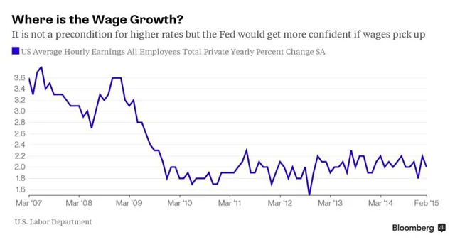 Mzdy nesmějí klesat. Yellenová uvedla, že Fed bude čekat na jejich růst jako na signál inflace, ačkoli ani to podle předsedkyně není předzvěstí toho, že ke zvýšení sazeb dojde. Existuje řada nepřímých důkazů, že se mzdy skutečně postupně zvedají, nemají ale zatím podporu v datech. Průměrný hodinový výdělek vzrostl za poslední rok do února jen o dvě procenta. To je od konce recese v červnu 2009 v souladu s průměrem.