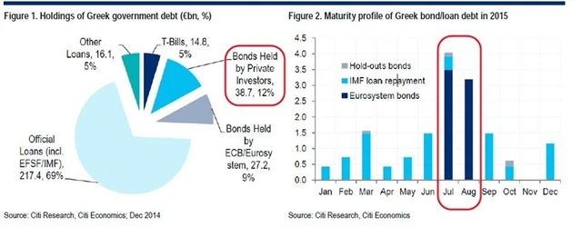 Přiznám se, že se mi ty tři grafy nechtějí překládat. Tak výjimečně jen pro angličtináře. Je to celkem k pochopení (tedy až na fakt, že vláda země velké jako Řecko dluží přes 300 miliard eur, to mi nějak nejde do hlavy).