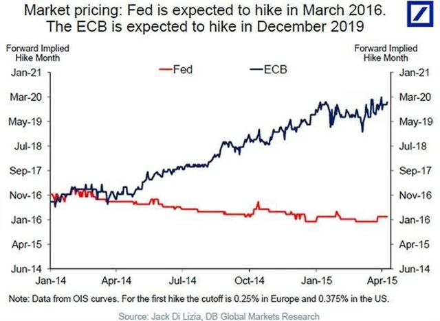 Není to nová story. Zatímco ECB o zvyšování sazeb zatím nejspíše ani neuvažuje, americký Fed se jím zabývá na každém zasedání měnového výboru. Implikované termíny prvního zvyšování sazeb obou centrálních bank (odvozené z OIS - overnight indexed swap) od sebe ještě nikdy nebyly tak vzdálené.