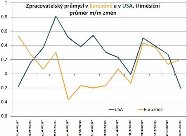 Jinou hypotézu nabízí srovnání s USA. Zatímco na druhé straně Atlantiku navzdory solidnímu vývoji domácí poptávky zpracovatelský průmysl, který je nejcitlivější na vývoj kurzu dolaru, dynamiku od dubna 2014 ztrácí, v eurozóně je to naopak. Slabé euro tak sice nevede k viditelnému růstu zahraniční poptávky po evropském průmyslovém zboží, který by se dal očekávat, ale možná způsobuje, že se tato poptávka nezhoršuje.