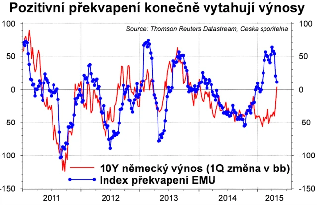 Anebo se na to lze dívat tak, že výnosy spíše dohánějí optimismus, který byl příznačný pro eurozónu v prvním čtvrtletí. Makrodata byla citelně lepší, než odhadoval trh, který podcenil pozitivní dopady nízkých cen ropy. S pozitivními překvapeními jde tradičně ruku v ruce i růst výnosů (i když posledních pár dnů byla data z měnové unie horší). Během prvního čtvrtletí se ovšem děl pravý opak, výnosy tedy klesaly. Takže teď by šlo jen o nápravu stavu věcí.