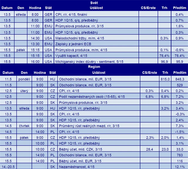 Mezi klíčová česká měsíční makrodata, jejichž zveřejnění připadá na druhý květnový týden, bude patřit dubnová inflace. Především vzhledem k postupnému zmírňování meziročního poklesu cen pohonných hmot vlivem rostoucích cen ropy na světových trzích lze počítat s jejím mírným zvýšením z březnových 0,2 %. V pátek Český statistický úřad zveřejní předběžný odhad růstu české ekonomiky za první letošní čtvrtletí. Nečekaně silný růst maloobchodních tržeb a pokračující solidní expanze českého průmyslu naznačují, že v mezičtvrtletním vyjádření dojde ke zrychlení růstu české ekonomiky na zhruba 1 % z 0,4 % ve čtvrtém čtvrtletí.