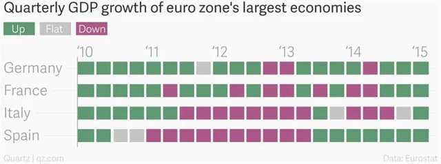 HDP eurozóny podle předběžných dat v prvním čtvrtletí 2015 mezikvartálně vzrostl o 0,4 %, tedy více než HDP USA a Spojeného království. Výhledy analytiků i politiků, například Evropské komise, ale ukazují na to, že v dalších čtvrtletích se karta opět obrátí.
