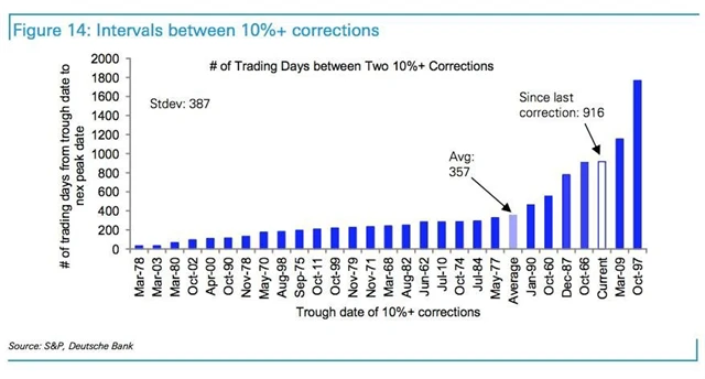Korekce alespoň o 10 % na americkém akciovém trhu (měřeno indexem S&P 500) nepřichází již 3,5 roku. Znamená to jedno z nejdelších takových období. "Myslíme si, že pravděpodobnost 5% a hlubšího pullbacku během léta je opravdu vysoká a krátkodobě radíme spíše opatrnost. Ocenění akcií je ještě vyšší než před rokem, nejistota na trhu s dluhopisy roste, zisky firem rostou minimálně a data z americké ekonomiky jsou již řadu týdnů velice slabá," upozorňuje David Bianco z Deutsche Bank. "Na korekci o 10 % se čeká již 916 obchodních dnů a vyvolat ji může leccos. Stačí, aby Fed naznačil, že chce zvýšit sazby již v září."
