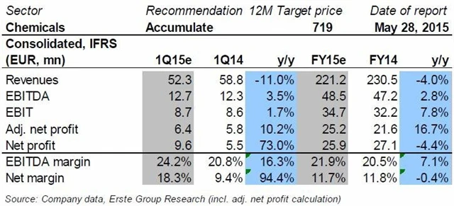 "Na úrovni EBITDA očekáváme růst o 3,5 % meziročně, převážně díky poklesu cen vstupů, tedy polyetylenu a polypropylenu. Díky egyptským aktivitám by měla produkce vzrůst zhruba o 3 %," napsal ve výhledu na českou výsledkovou sezónu Petr Bártek, analytik z České spořitelny. "Prodeje ale asi budou meziročně stagnovat, před rokem firma vyprodávala zásoby. Personální náklady budou zřejmě o čtvrtinu vyšší kvůli vývoji kurzu egyptské měny vůči euru. Úrokové náklady firmy by měly klesnout díky tomu, že asi 60 % dluhu firmy bylo refinancováno na konci roku 2014. Čistý zisk byl měl narůst asi o desetinu.