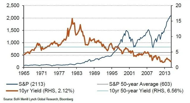 První graf z Flanaganovy dílny ukazuje index S&P 500 a výnos 10letého vládního dluhopisu USA. Vzhledem k tomu, že šéfka Fedu hodnotí akciové valuace jako "vcelku vysoké", jde o důležitý graf. Flanagan tvrdí, že "data Yellenové dávají za pravdu".