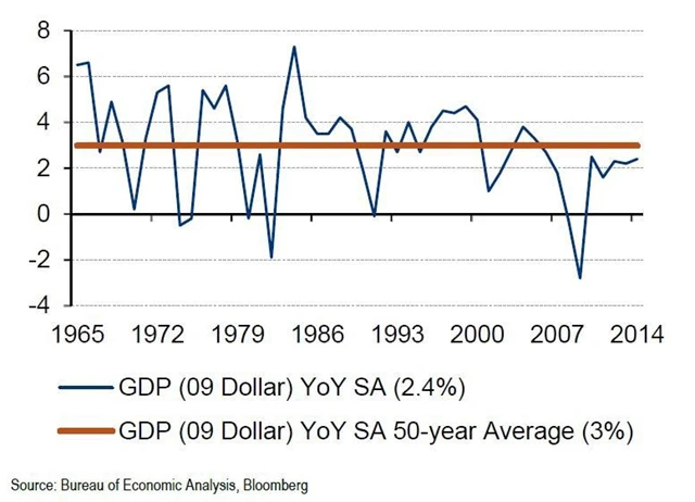 Oba ukazatele zůstávají pod "normálem". Naposledy byl meziroční růst nad 3 %, tedy 50letým průměrem, v roce 2005. Hrozbou zůstává to, že je současné oživení ekonomiky historicky podprůměrně silné, ačkoli šest let trvá nejuvolněnější a nejagresivnější měnová politika v historii Fedu.