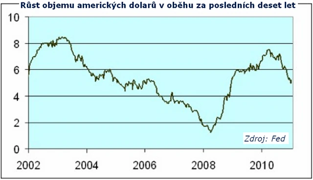 Když lidé hovoří o tištění peněz, jako první nás možná napadne, že mají na mysli zelené kousky papíru s obrázky mrtvých prezidentů. Následující graf ukazuje růst oběživa za posledních deset let (dvouleté intervaly) – za poslední dva roky vzrostl jeho objem o 5,2 % ročně, což je mírně pod desetiletým průměrem.