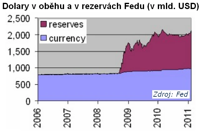Pokud však Fed v rámci QE2 netiskl peníze, čím platil vše, co nakoupil? Fed prostě zvýšil rezervy, které u něho banky v elektronické formě drží. Ty po roce 2008 explodovaly, jak ukazuje druhý graf vývoje objemu oběživa a rezerv v miliardách dolarů: