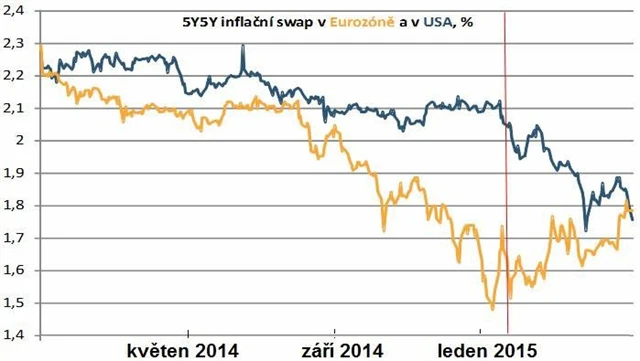 Inflační swapy (5Y5Y inflační swap je swap začínající za 5 let s maturitou 5 let, kde jedna strana platí fixní sazbu, kterou vidíme na grafu, a druhá strana platí sazbu odpovídající inflaci – pozn. aut.) v USA a v eurozóně ukazují, že trh přehodnotil dlouhodobý výhled evropské inflace pouze minimálně.