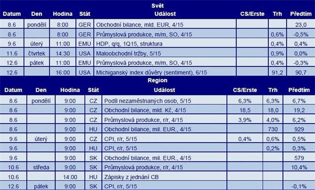 Mezi hlavní makrodata v ČR, která budou v hledáčku trhu pro tento týden, budou patřit údaje o květnové inflaci. V případě České republiky počítáme s mírným poklesem, který bude souviset především s vysokou základnou z května 2014. Mírné zpomalení pak lze čekat i v případě údaje o dubnovém růstu českého průmyslu, které bude souviset především s jednorázovým meziročním snížením produkce českých automobilek. Měsíční údaje o vývoji inflace a průmyslové produkce ještě tento týden v ČR doplní dubnová obchodní bilance a podíl nezaměstnaných osob za květen, který zřejmě opět výrazněji poklesne s ohledem na pokračující nástup sezónních prací.