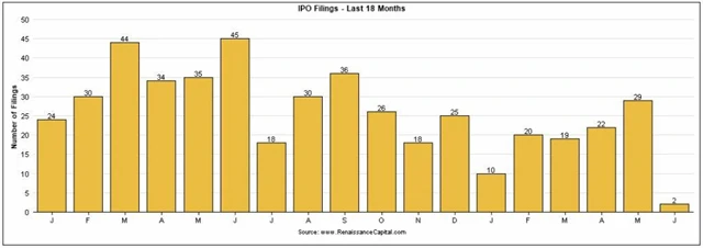 Zatímco americké indexy stále rostou, počet IPO již zhruba rok klesá. Podle dat společnosti Renaissance Capital letos na burzách v USA do konce května proběhlo 69 primárních úpisů akcií firem s tržní kapitalizací nad 50 milionů USD. V prvním červnovém týdnu proběhly čtyři další úpisy.