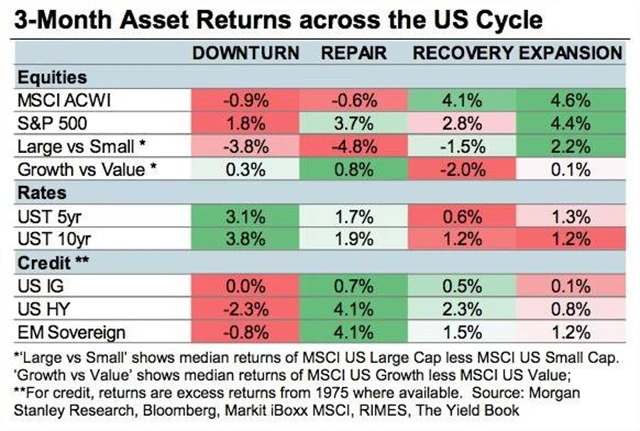 "V této fázi, tedy během přechodu od oživení k expanzi ekonomiky, se nejlépe daří akciím, zatímco kredit a výnosy z dluhopisů jsou spíše méně atraktivní. Společnosti s velkou tržní kapitalizací mají na burze tendenci překonat výkon středně velkých a menších firem. Volatilita, možná trochu nečekaně, má sklon spíše k poklesu," píší analytici z Morgan Stanley.