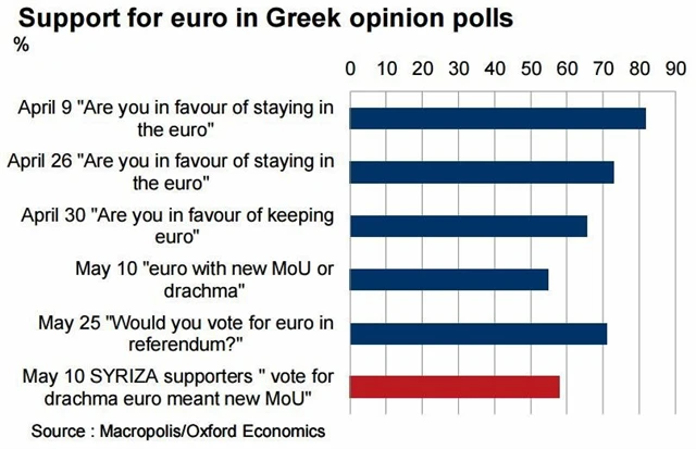 Ochota Řeků přinést eurozóně další oběti začíná být poněkud omezená. Veřejný průzkum z 10. května letošního roku ukázal, že 58 % příznivců levicové koalice SYRIZA upřednostňuje znovupřijetí drachmy před pokračováním úsporných opatření.