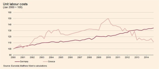 Je možné, že by další snižování relativních nákladů na práci mělo ještě větší vliv na řeckou obchodní bilanci. Tyto dodatečné redukce ale nejsou možné, dokud Řecko zůstane připoutané k jednotné měně.