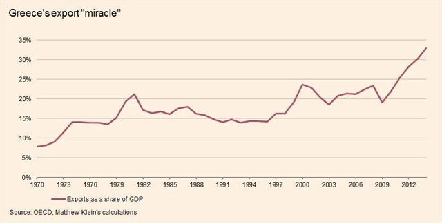 Navzdory zlepšení konkurenceschopnosti je suma eur, kterou Řecko získává z vývozu, prakticky neměnná. Je stabilní již roky a stále je nižší než před krizí. Drží se ale stabilní na pozadí hroutící se ekonomiky, a tak se podíl vývozu na HDP zvyšuje.