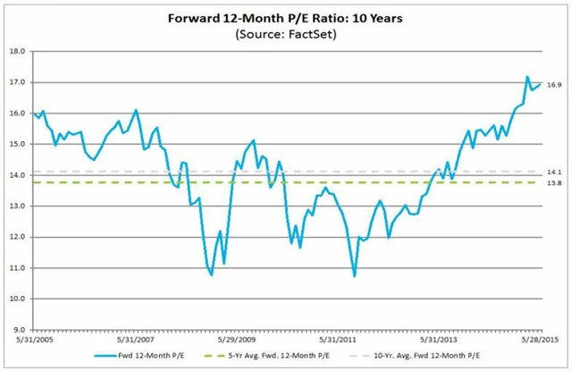 To, že jsou akcie v absolutních hodnotách na maximech, ještě nemusí znamenat, že jsou překoupené a projdou výraznou korekcí. Více by mohlo napovědět relativní ocenění vyjádřené ukazatelem P/E (poměr ceny akcie k zisku na akcii). Takzvané forwardové P/E indexu S&P 500 (počítané na základě zisků očekávaných v příštích 12 měsících) se na konci května pohybovalo mírně pod 17, desetiletý průměr je přitom jen 14,1 a pětiletý 13,8. Bezmezně ale nelze věřit ani tomuto ukazateli.