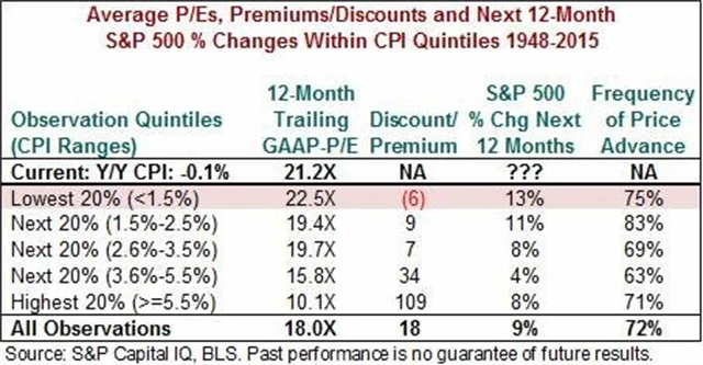 Sam Stovall, akciový stratég z S&P Capital IQ, zdůrazňuje, že období nízké inflace je historicky charakteristické zvýšeným relativním oceněním akcií podle ukazatele P/E. Na vliv inflace na valuaci akcií upozorňuje i Belski. "Aby bylo možné současné valuace označit za vysoké, musela by meziroční míra inflace stoupnout alespoň nad 3 %," říká.