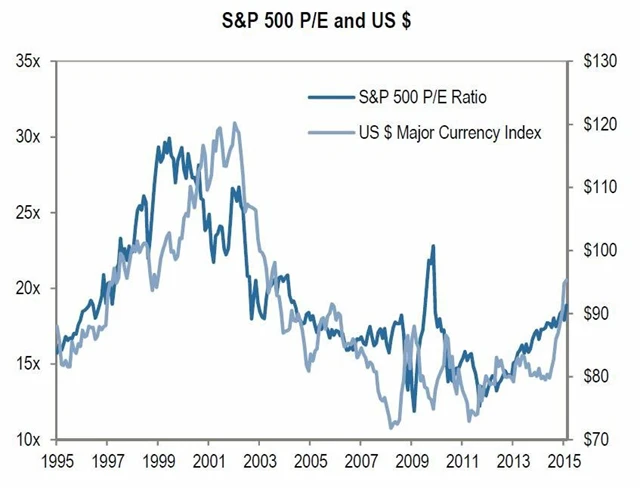 Svoji roli ve valuaci akcií hraje také kurz eurodolaru. Belski vysvětluje, že posilování dolaru lze mimo jiné chápat jako doklad pokračujícího zotavování a růstu americké ekonomiky, což je pro společnosti pozitivní. Za dvojsečnou zbraň pak lze považovat nízké ceny ropy, které na jednu stranu podkopávají hospodářské výsledky amerických těžařů, na druhou stranu však snižují náklady, a tedy vylepšují výsledky podniků z jiných odvětví. V případě cenných papírů těžařů mohou P/E zvyšovat horší hospodářské výsledky (při pomalejším poklesu cen akcií), u ostatních podniků zase mohou investoři zrychlit nákupy díky očekávání úspor za paliva a další produkty navázané na ropu.