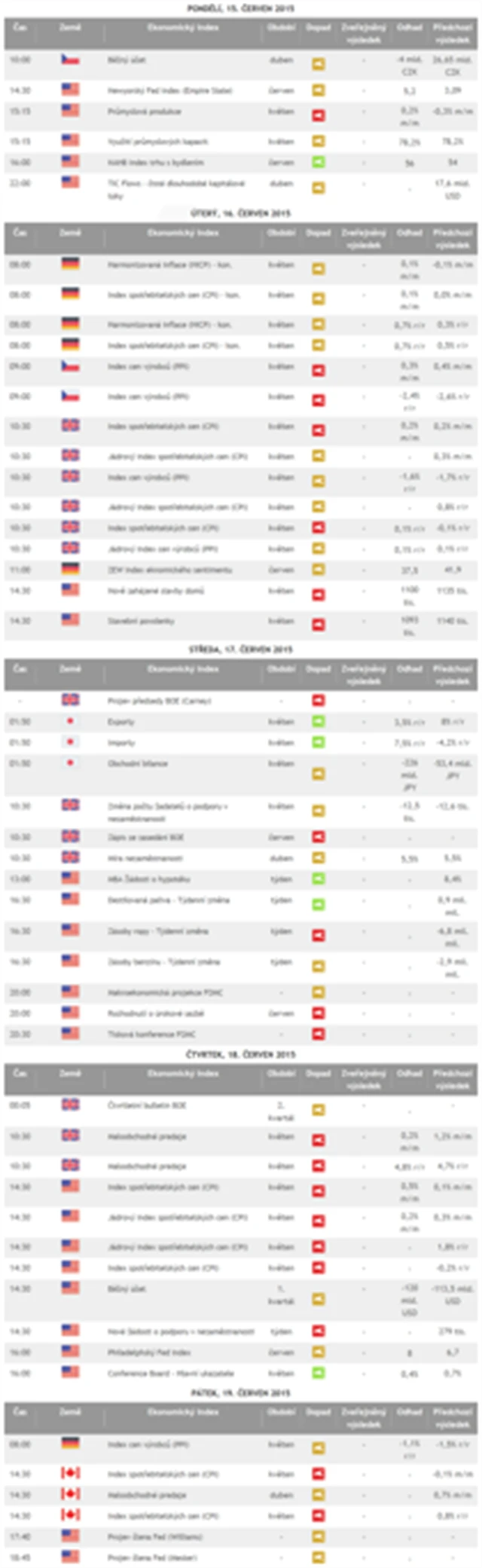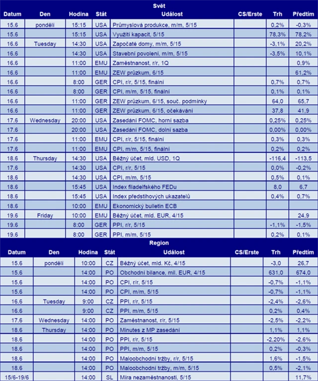 Klíčovou událostí třetího červnového týdne bude jednoznačně dvoudenní zasedání měnového výboru americké centrální banky, které skončí ve středu. Analytici vesměs očekávají, že Fed ponechá měnovou politiku beze změny, najdou se však i ojedinělé hlasy, které tvrdí, že by banka mohla zariskovat a přistoupit k prvnímu zvýšení úrokových sazeb od finanční krize z roku 2008. Pokud Fed sazby nezvýší, což je pravděpodobnější scénář, bude zajímavé, co na tiskové konferenci po zasedání FOMC řekne šéfka banky Janet Yellenová, respektive zda "změní svoji dosavadní rétoriku", což Fed dříve označil za krok, který bude předcházet dalšímu utažení měnové politiky.