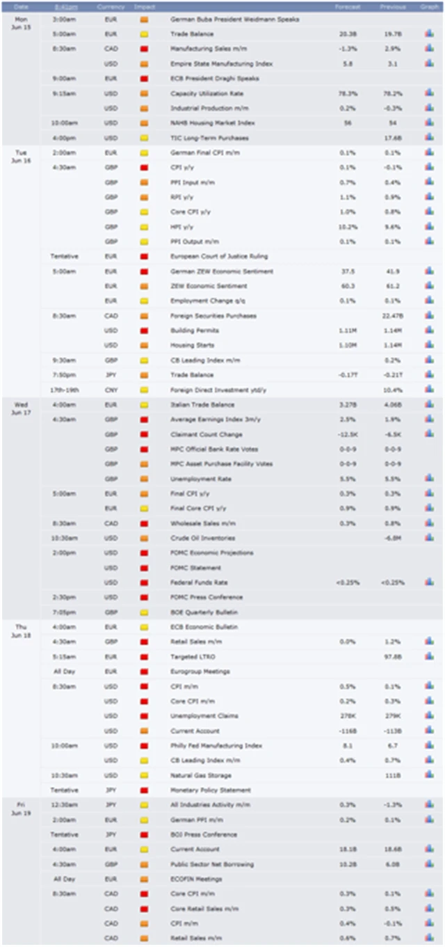 Třetí červnový týden bude po tom druhém, relativně odpočinkovém, nabitý daty. Navíc zasedá FOMC. Právě toto zasedání lze označit za událost týdne s největší pravděpodobností výrazného dopadu na chování trhů. Pravděpodobnost výrazné reakce zvyšuje nejistota, která panuje kolem začátku zvyšování sazeb v USA. Na jednu stranu se objevila doporučení významných mezinárodních organizací (MMF, Světová banka) počkat se zvýšením sazeb do příštího roku, na druhou stranu jsou makroekonomická data v poslední době relativně silná. Od Fedu se tak lze dočkat lecčeho a trh může mít hodně důvodů reagovat.