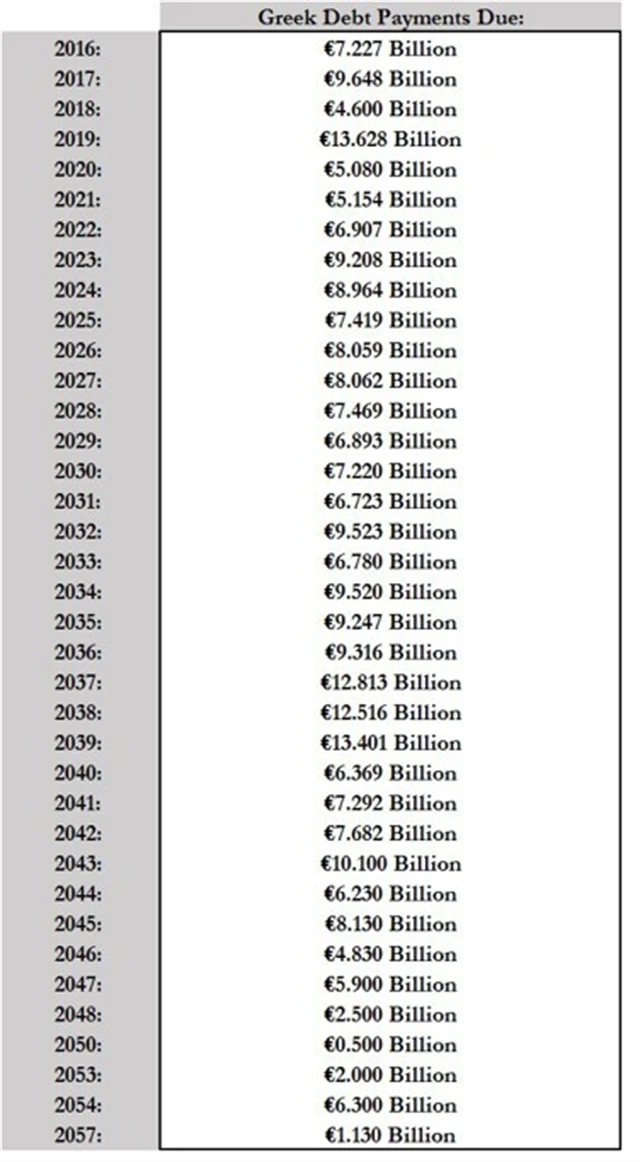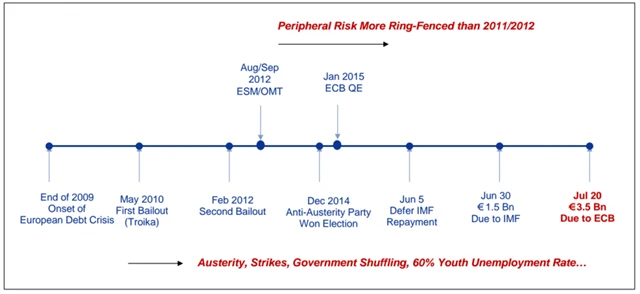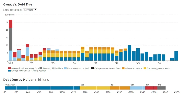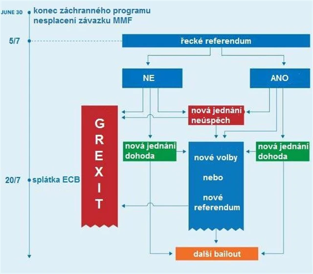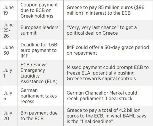3.50 Podle Bank of America Merrill Lynch nemůže Řecko bez nových peněz přežít další měsíc. I kdyby MMF v případě nezaplacení 1,6 miliardy eur na konci června nabídl měsíc navíc, může hned vzápětí dojít ke zmrazení dodávek nouzové likvidity řeckým bankám (ELA) ze strany ECB, což by vedlo pravděpodobně ke kapitálovým kontrolám a dalším omezením v sektoru. 20. července je pak splatných 4,2 miliardy eur ECB, což je bez nových peněz pro Řecko prakticky nedosažitelná částka.