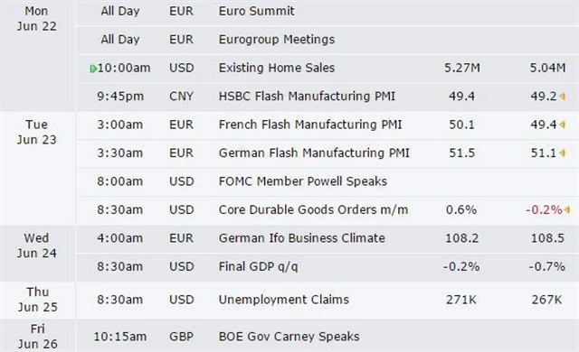 Nový týden bude hlavně o Řecku. V pondělí se koná mimořádná schůzka euroskupiny a hned po ní setkání vrcholných představitelů zemí eurozóny. Angela Merkelová o víkendu uvedla, že by se politici měli sejít již nad novým návrhem řešení krize. Šibeniční termín vede ke spekulacím o dalším dočasném řešení, například do září. Ve čtvrtek a v pátek standardně zasedá Evropská rada.