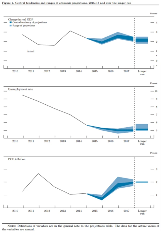Goldman Sachs nedávno revidovala celoroční výhled růstu amerického HDP a očekává 3% tempo v druhé polovině roku. Také Merrill Lynch revidovala svůj výhled z 2,3% růstu na 2,9 %. Naproti tomu Světová banka zůstává opatrnější (nedávno revidovala níže předpověď amerického hospodářského růstu, stále ale počítá s 2,7% tempem v roce 2015). Jak vidí situaci Fed, je patrné z následujících grafů.