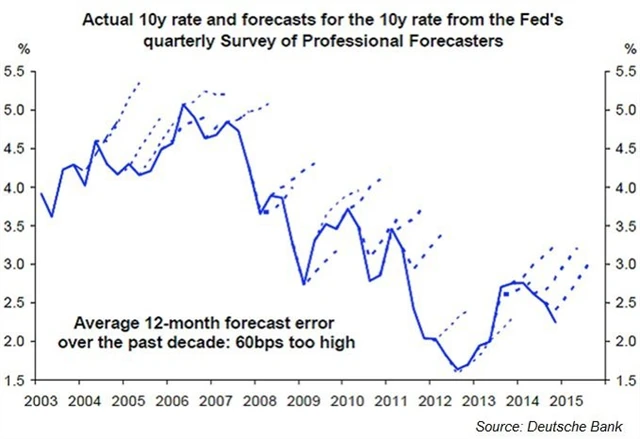 Téměř každý, kdo se snažil předpovídat vývoj trhů během posledního desetiletí, byl mimo. Průměrná předpověď sazeb byla o 60 bazických bodů vyšší než pozdější realita. Konsenzuální predikce pro sazby jsou nyní na 50 bazických bodech, z čehož vyplývá, že je klidně možné, že zůstanou beze změny do roku 2016. Výnosy 10letých vládních dluhopisů USA již krátce narostly na 2,5 %, nelze ale očekávat agresivní utahování měnové politiky ani to, že by výnosy zůstaly nad 2,5 % delší dobu.