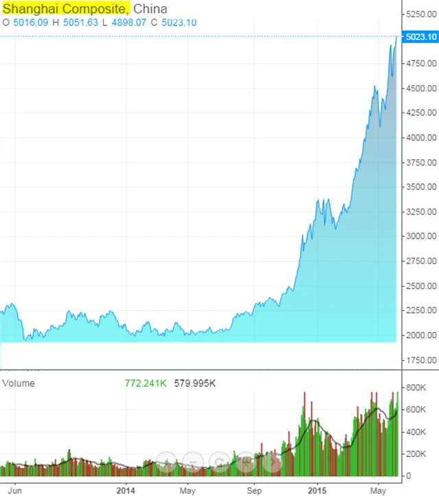 Zatímco ze západu nepřicházejí velké hrozby, jedna velká se formuje na východě. Čína je časovaná bomba z mnoha důvodů. Tamní akcie zažily masivní rally díky nadějím, že stimulace popožene ekonomiku. V důsledku toho došlo k nákupní mánii, která nafoukla obrovskou bublinu. Čínské technologické akcie se obchodují průměrně za více než 220násobek projektovaných zisků. Významně také narostl takzvaný margin debt s tím, jak si čínští investoři půjčují na "bezpečné investice" do akcií. Firmy hladové po kapitálu vyvolaly vlnu IPO, která na trh dostala od ledna 2014 225 nových titulů s průměrným výkonem 400 % od první chvíle, kdy se začaly obchodovat na burze. Firmám s takzvaně "áčkovými" akciemi na burzách v Šanghaji a Šenzenu mají růst zisky nejméně za poslední tři roky a finanční sektor, bojující se špatnými dluhy, je jen jednou z dalších velkých brzd.