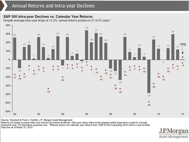 Volatilita je v letošním roce nízká a historie ukazuje, že velký pokles v takovémto prostředí není příliš častý. Byly tu podobné trhy, kdy došlo k dočasným hlubokým poklesům (jako v roce 2001), trh se ale zpravidla rychle zotavil. V historii byste nenašli mnoho poklesových roků. Dokazuje to graf z dílny JPMorgan, do něhož byly zachyceny nejhorší dočasné propady indexu S&P 500 v každém ze sledovaných let a výnos za celý rok vyplývající ze závěrečných hodnot k 31. prosinci.