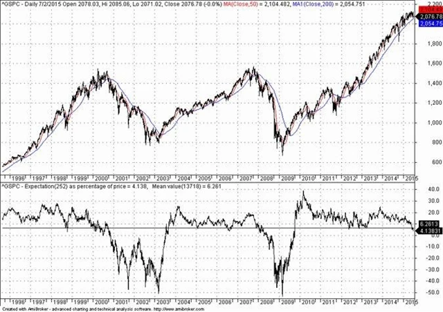 Mike Harris z blogu Price Action Lab nedávno představil indikátor, který je konstruován jako 252denní očekávání ve vztahu k zavírací ceně. Ukazatel se minulý měsíc propadl pod svůj dlouhodobý průměr.