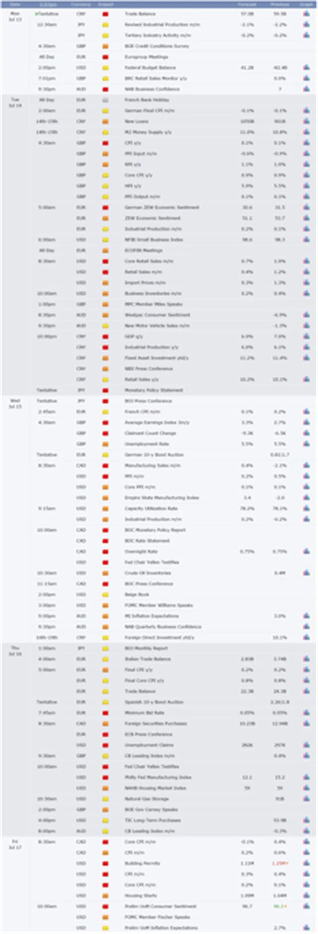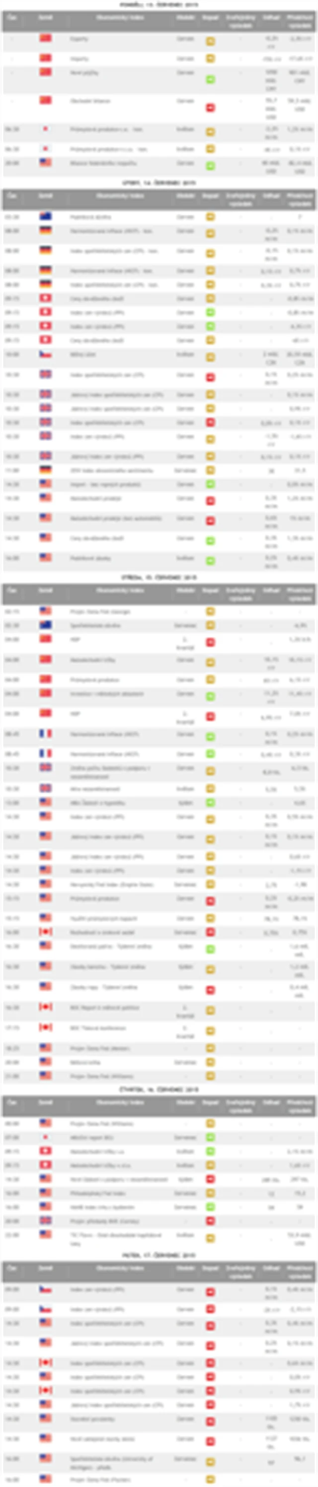 Z ekonomických dat budou v nadcházejícím týdnu nejzajímavější údaje o německé inflaci a amerických maloobchodních tržbách (úterý), čínském HDP (středa) a inflaci v eurozóně (čtvrtek) a Spojených státech (pátek). Kromě dat budou investoři sledovat také výsledky zasedání centrálních bank v Japonsku (středa) a eurozóně (čtvrtek). Z českých makrodat vyjdou v úterý výsledek běžného účtu za květen a v pátek index výrobních cen za červen.