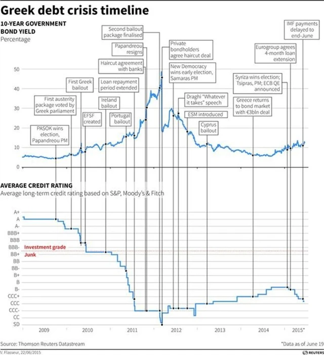 Do grafu výnosu řeckých 10letých dluhopisů a ratingu země na konci června již přibyla nová "vlaječka" s popiskem "Řecko první vyspělou zemí, která nesplatila dluh MMF". Ve hře jsou nyní prapory jako "návrat k drachmě", tedy "první země, která vystoupila z eurozóny", dále "podmínečně vyloučený člen eurozóny", ale také "třetí záchranný balík schválen, agónie prodloužena". Vymyslet se jich dá mnohem více. Ta příští vlaječka také podle všeho ani zdaleka nebude poslední.