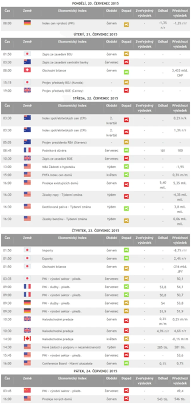 Polovina týdne bude na ekonomická data zajímavější. Austrálie zveřejní v noci na středu inflaci a s projevem vystoupí šéf tamní centrální banky Glenn Stevens. V Japonsku vyjde celkový index podnikatelské aktivity, ve Francii index podnikatelského klimatu, v Itálii průmyslové objednávky a maloobchodní tržby a britská centrální banka zveřejní zápis ze svého posledního zasedání, který ukáže, kolik jejích hlasujících členů zvedlo ruku pro ponechání měnové politiky beze změny. Evropská komise prozradí, jak se ve společenství zemí platících eurem vyvíjí spotřebitelská důvěra, a v USA bude odpoledne zveřejněn index cen domů. Společnost Markit Economics přidá předběžný index nákupních manažerů v americkém sektoru služeb a kompozitní PMI za červenec a odtajněny budou také údaje prodejích starších domů v USA. Kromě toho vyjdou ve Spojených státech jako každou středu údaje o počtu žádostí o hypotéku a zpráva o vývoji zásob ropy. Výsledky hospodaření za druhý kvartál představí ve Spojených státech Boeing, Coca-Cola či American Express a v Evropě například Iberdrola.