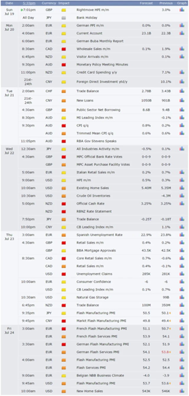 V noci na pondělí vyjde v Číně index cen domů. Investoři v Japonsku si díky státnímu svátku užijí den volna. Německo na trh dopoledne pošle index cen výrobců za červen a Bundesbank vydá pravidelnou měsíční zprávu o stavu ekonomiky. Eurozóna ještě zveřejní výsledek běžného účtu, Spojené království přidá statistiku půjček veřejného sektoru za červen a Portugalsko zprávu o inflaci a výsledek obchodní bilance. Spojené státy v pondělí žádná data nezveřejní. Kvartální hospodářské výsledky na trh pošlou například Halliburton, Morgan Stanley nebo IBM.