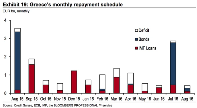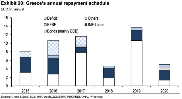 Naděje pro Řecko v současnosti vyplývají spíše z deklarací (rostoucí evropská ekonomika pomůže, privatizace a následné soukromé investice také, lze ještě více ušetřit a tak dále). I ECB podle vyjádření některých svých zástupců dříve či později předpokládá další restrukturalizaci řeckého dluhu. Dokud k ní ale nedojde, platí níže uvedený splátkový kalendář. Dokáže si na jeho plnění dlouhou recesí zdecimovaná ekonomika vydělat? Většina analytiků o tom pochybuje, politici ale tvrdí, že tomu věří.