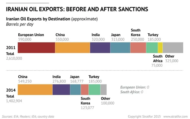 Dohoda Íránu se světovými mocnostmi o jeho jaderném programu podle analytiků mimo jiné znamená, že na světové trhy po zrušení sankcí namířených proti Teheránu přiteče velké množství íránské ropy. Analytici z Goldman Sachs hovoří o nárůstu vývozu ropy z Íránu o 200 až 400 tisíc barelů denně v příštím roce, některé odhady jsou dokonce vyšší. Organizace zemí vyvážejících ropu (OPEC) ale uklidňuje, že růst světové poptávky po ropě bude v roce 2016 tak výrazný, že s přehledem spolkne i případný dodatečný vývoz z Íránu. Poptávka po ropě by mimo jiné měla vzrůst v Číně, kde je pro rok 2016 v plánu otevření rafinérského odvětví také nestátním firmám.